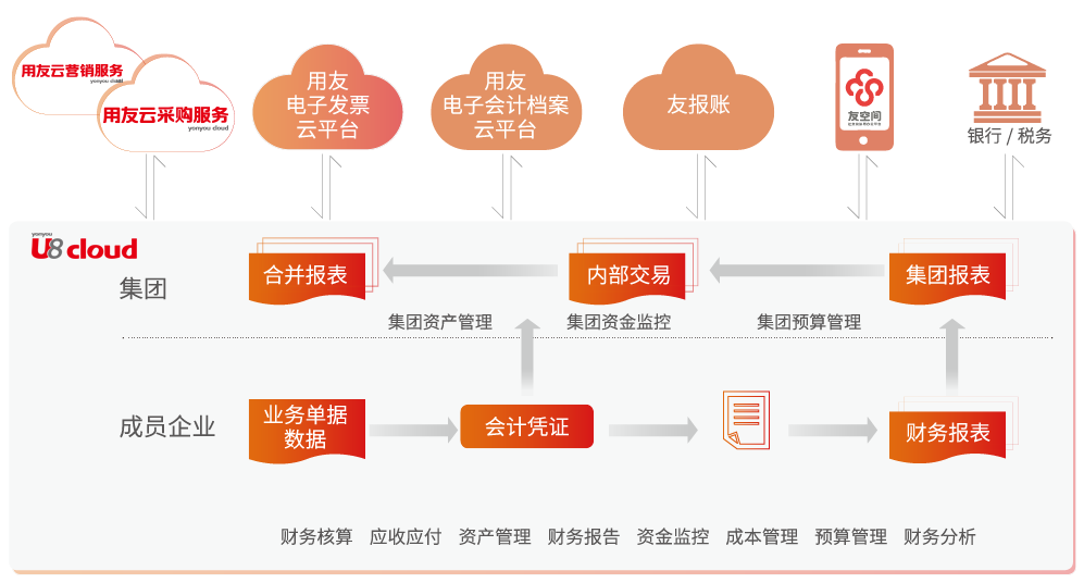 U8 cloud財務管理應用,滿足智能財務新模式,通過用友云與客戶、供應商、服務商等產(chǎn)業(yè)鏈伙伴進行實時交易和財務信息共享與傳遞,使多組織企業(yè)的智能化財務核算、財務管理與財務分析更高效