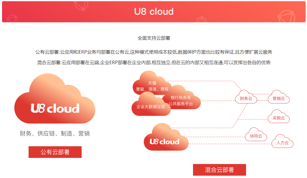 混合云部署:云應用部署在云端,企業(yè)ERP部署在企業(yè)內(nèi)部,相互獨立,但在云的內(nèi)部又相互連通,可以發(fā)揮出各自的優(yōu)勢
