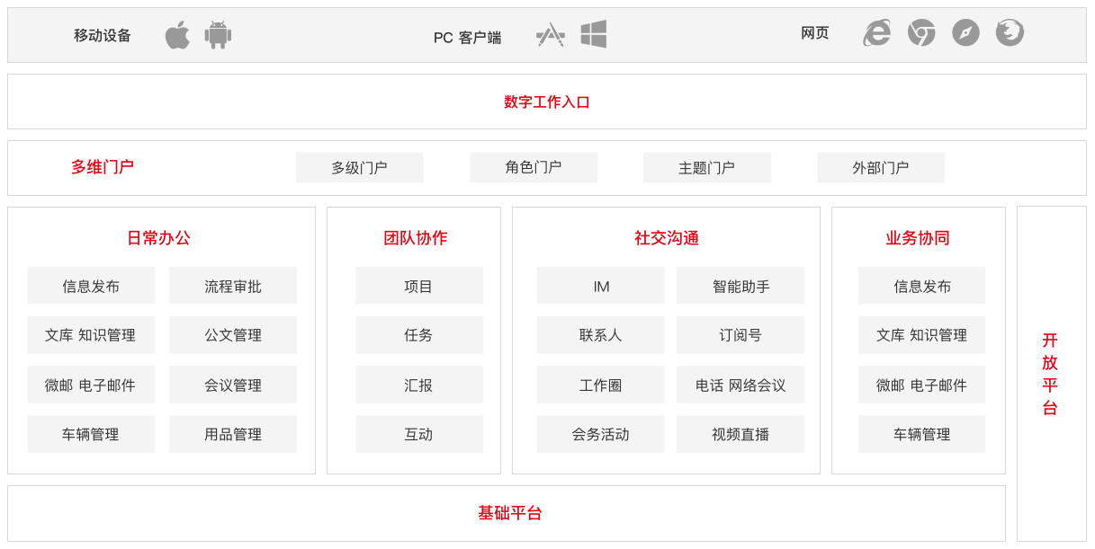知識(shí)文庫(kù)、信息發(fā)布、企業(yè)訂閱號(hào)、社交工作圈等, 打造企業(yè)知識(shí)分享和創(chuàng)新環(huán)境,激活企業(yè)組織文化。