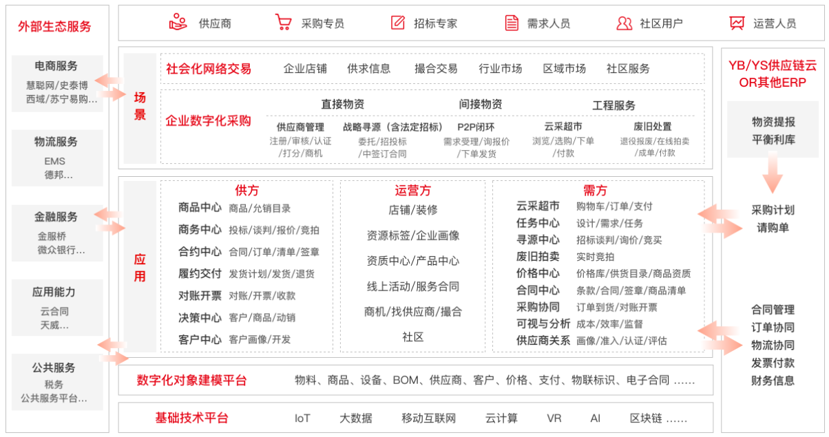 社會化網(wǎng)絡(luò)交易平臺:以連接、協(xié)同、共享、創(chuàng)新為核心理念,立足需方構(gòu)建涵蓋采購尋源(招標(biāo)/談判/詢價)、合同中心、采購協(xié)同、云采超市、廢舊拍賣、可視與分析、供應(yīng)商關(guān)系管理的社會化網(wǎng)絡(luò)交易平臺