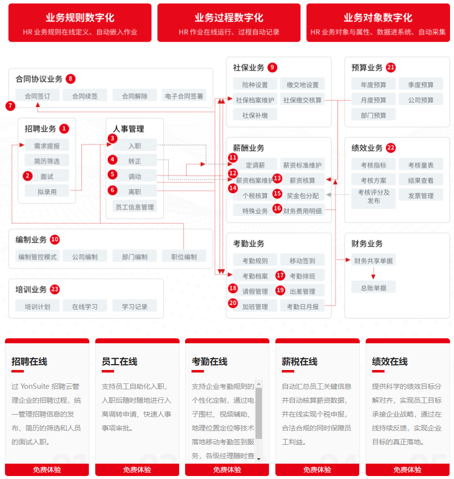 創(chuàng)新企業(yè)追求的人力服務(wù)是:員工滿意度、快速高效招到合適人才、精確賦能、激勵式薪酬、保障戰(zhàn)略目標落地的績 效方案。YonSuite 提供以人為核心的人力服務(wù),包含在線招聘、在線員工入離調(diào)轉(zhuǎn)、電子人事合同、在線考勤、在線薪酬 績效等。